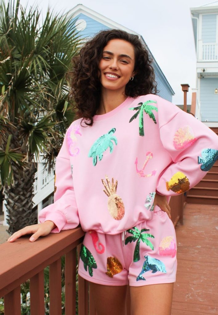 Stand out in our sequin sets featuring fun and bright themes. Features a crewneck pullover and matching shorts with a beachy themed design. Made of 30% pet sequin and 70% polyester.