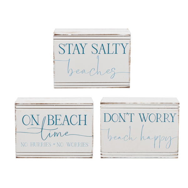 Add some beachy humor to your table decor with these message blocks! With three different styles to choose from, bring the fun to any gathering. Guaranteed to bring a smile to your face.