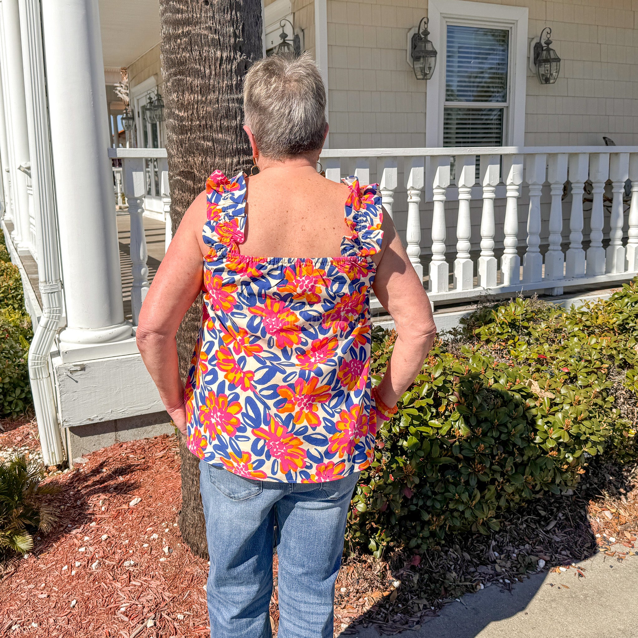 Get ready to ruffle some feathers with our Charlie Ruffle Top! Made from durable polyester, this sleeveless top features a trendy square neck and playful ruffle straps. The loose fit and swing hem make it perfect for any occasion.