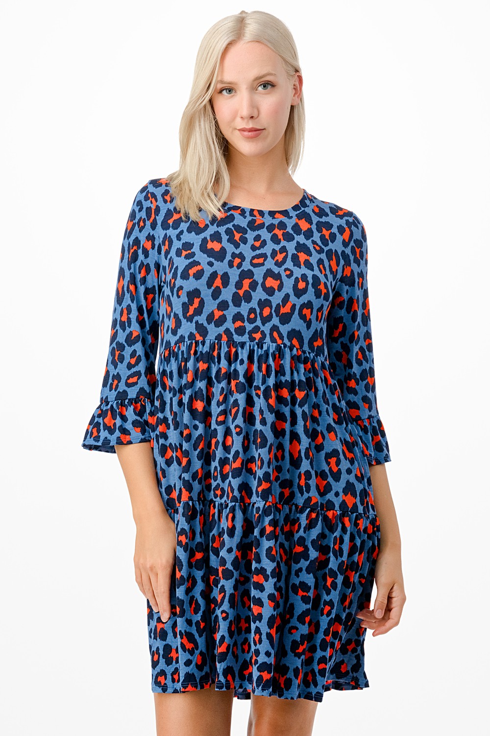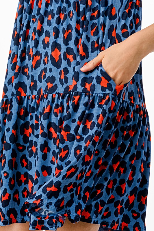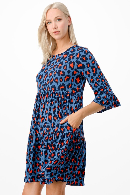 CHEETAH PRINT RUFFLED 3/4 SLEEVES DRESS WITH POCKETS.