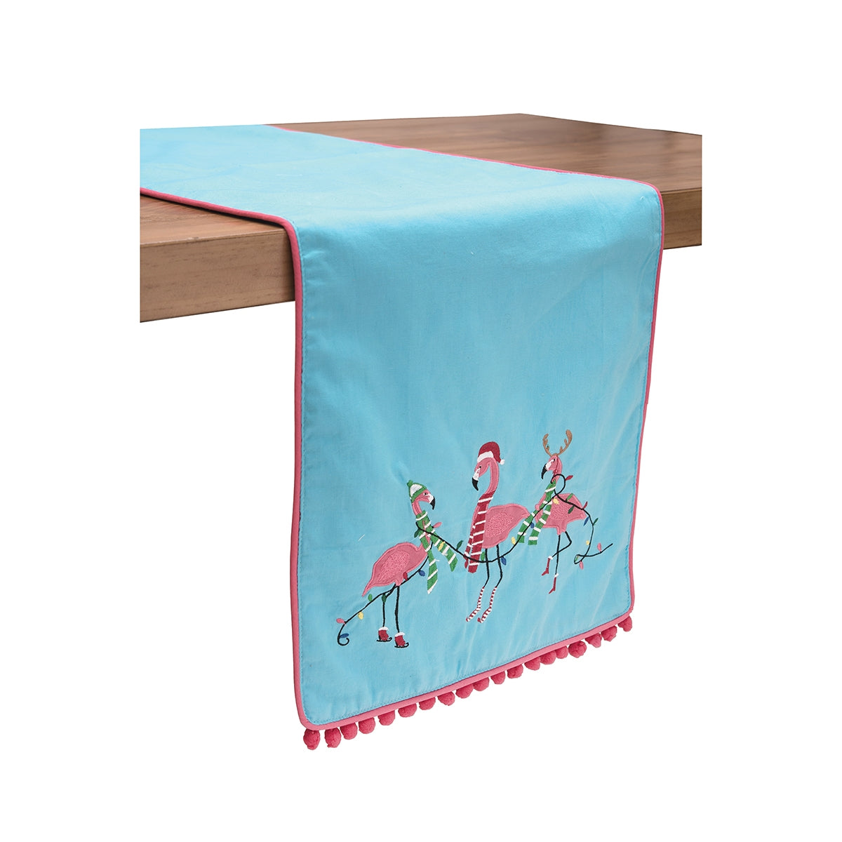 Dress up your holiday table with this delightful Christmas Flamingos Table Runner. With applique and embroidered details, it adds a touch of whimsy to your festive decor. Made of cotton, measuring 14in. x 51in., it's perfect for celebrating the season.