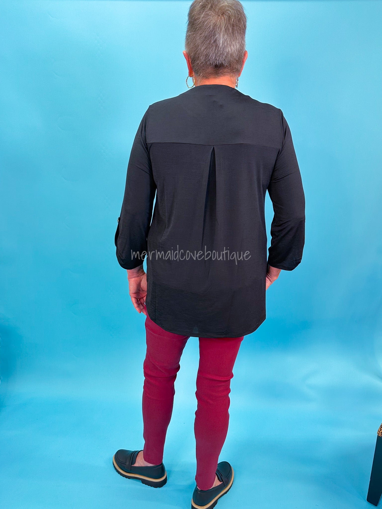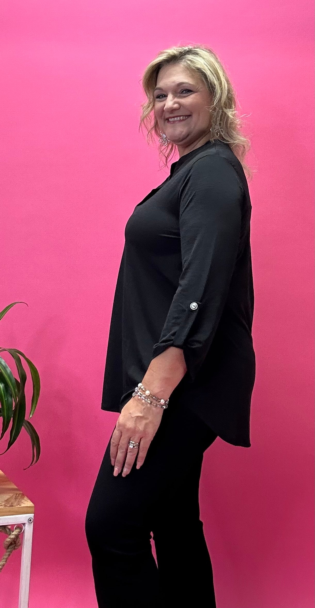 Look your best with the Solid Lizzy Top! This classic design features a traditional gabby fit with a v neck and 3/4 length sleeves. The wrinkle-free fabric keeps you looking neat and professional all day, and the true-to-size fit ensures a comfortable fit that flatters your figure.