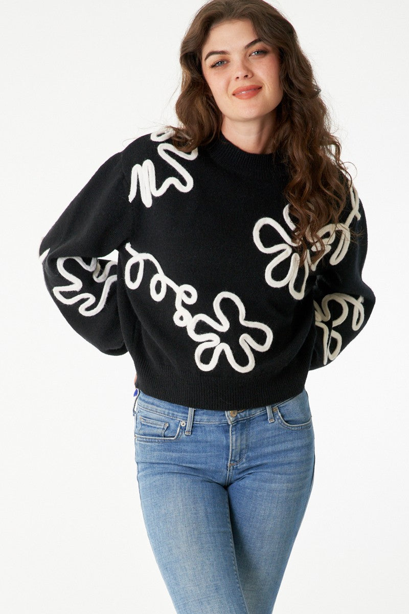 Make a statement in our Daisy Sweater! An adorable floral outline and mock neck gives a playful look to this cute and fun sweater. Show off your style and make a splash with the flirtiest of fits!