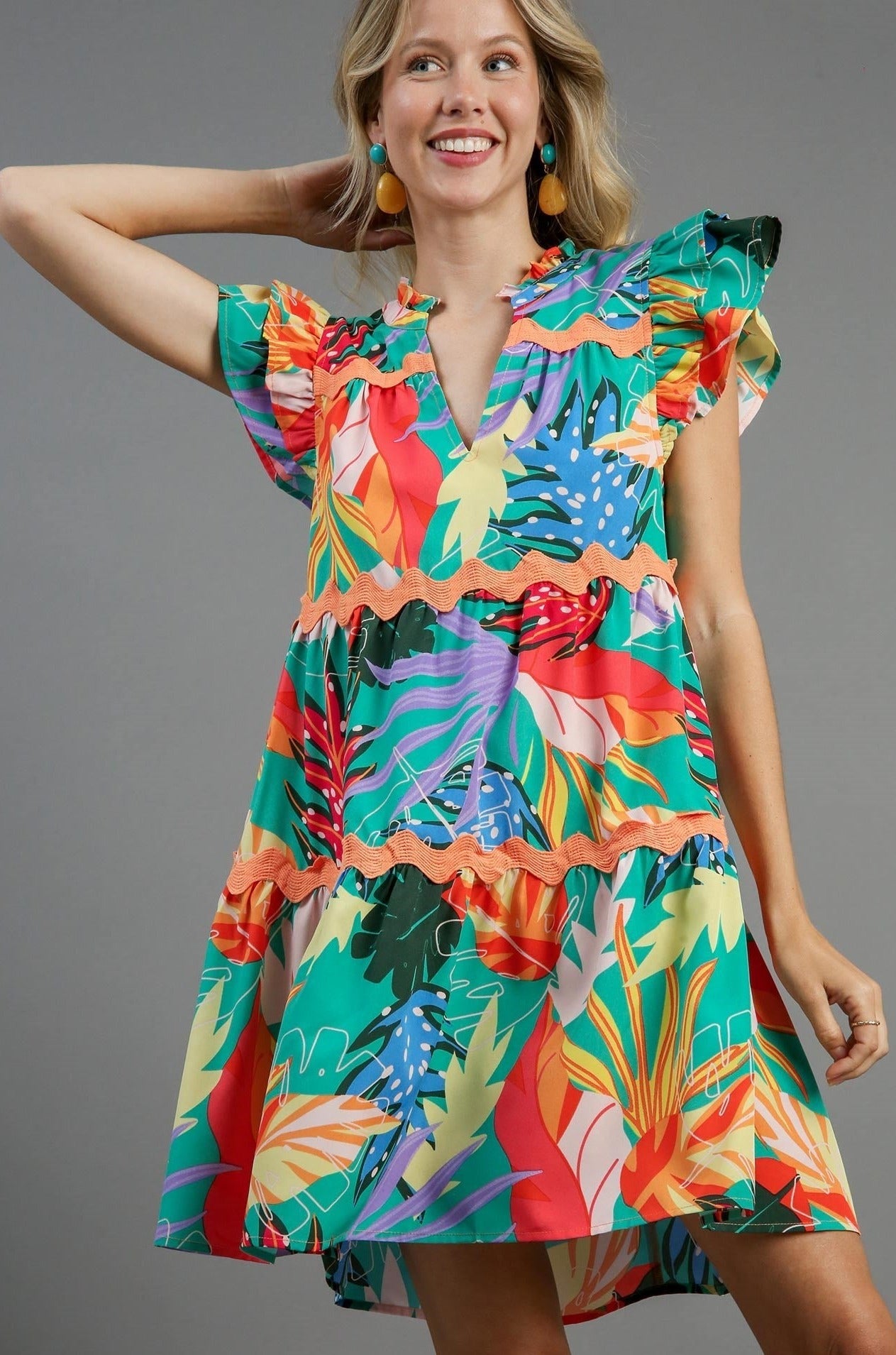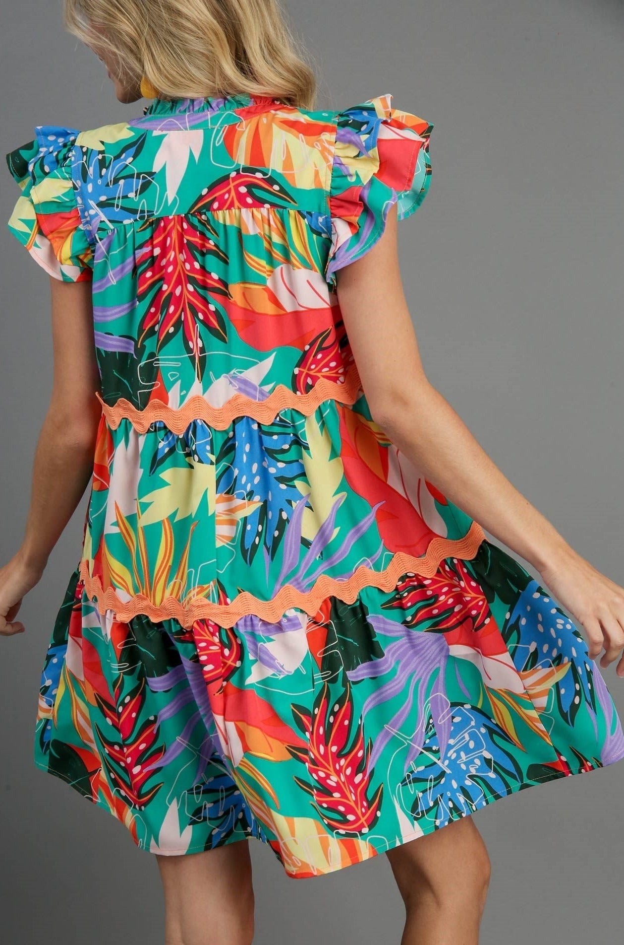 Experience a taste of paradise in our Day in Cabo Dress. The lively tropical print is complemented by playful ric rac trim and flirty ruffle sleeves. With a breezy tiered A-line silhouette, this dress is perfect for a fun day in the sun. (Just don't forget the sunscreen)!