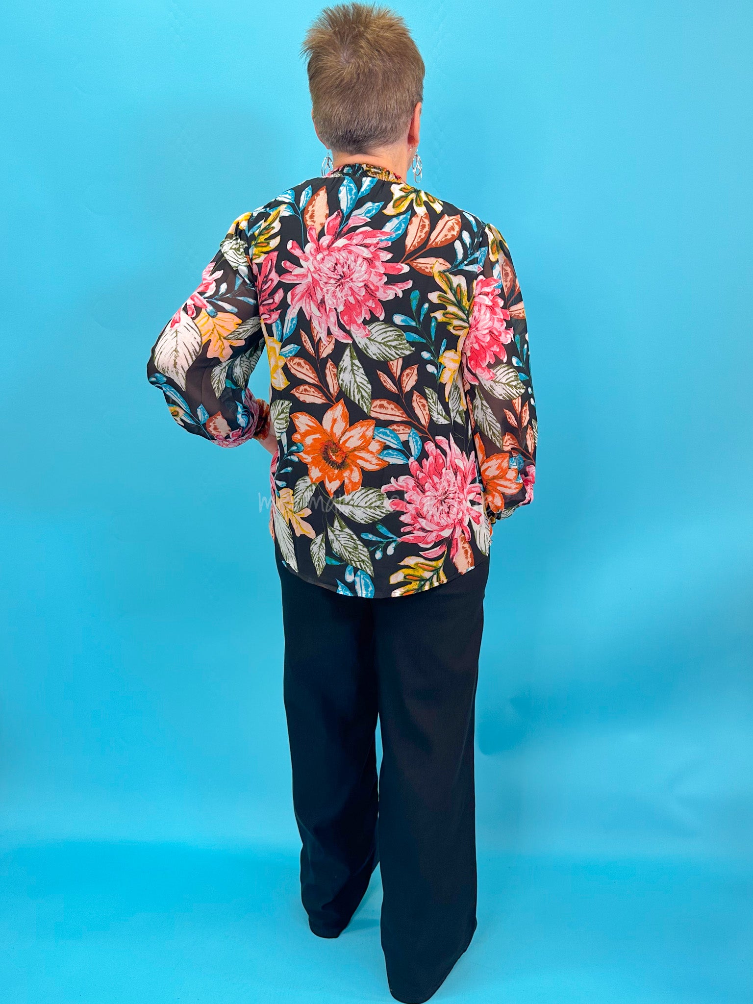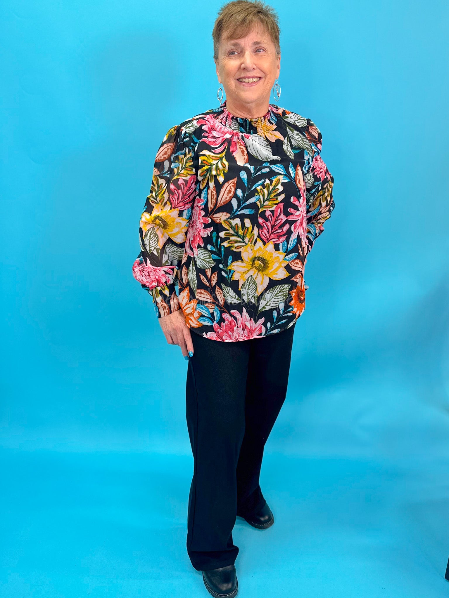The Dreaming Of Flowers Top is perfect for any special occasion. Made from lightweight chiffon fabric featuring a flower print, this top has long sleeves and buttoned cuffs. It's finished with a smocked neck for comfortable all-day wear. Constructed of 100% polyester, this lined top is semi-sheer for a sleek look.