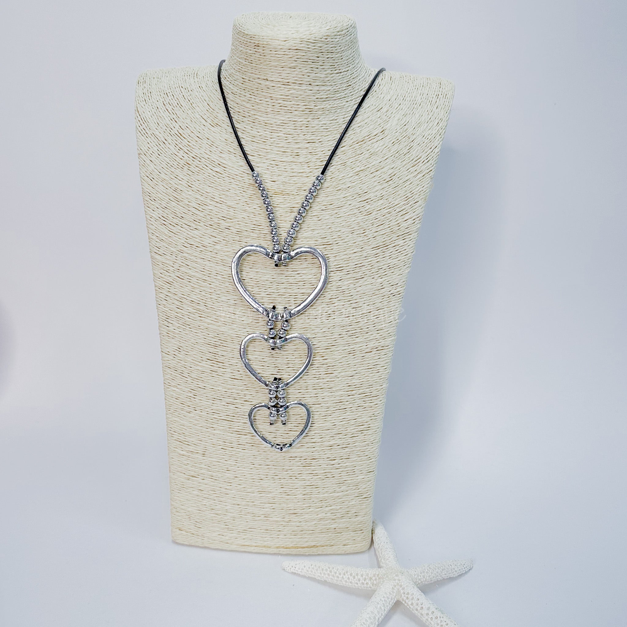 Let your style shine with this fun and flirty necklace featuring three shimmering silver hearts. The black leather cord is dotted with silver beads, creating a look that's sure to turn heads! Dreaming of hearts? Look no further.