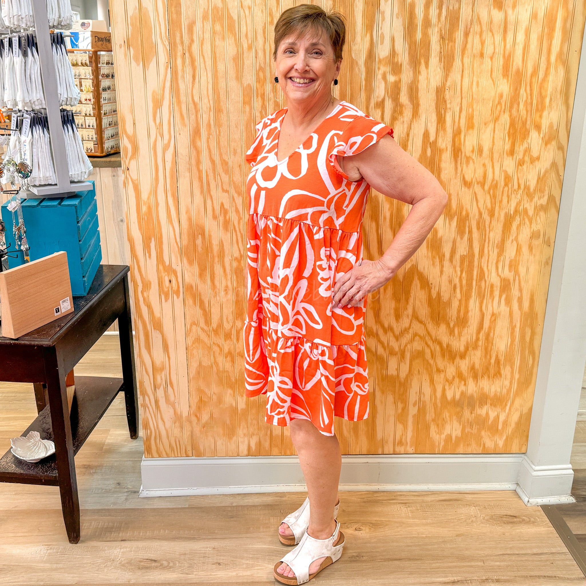 Unleash your inner flower child with our Floral Ginny Dress in Coral! Made with textured polyester, this dress features flutter sleeves and a flirty V-neck. The tiered skirt adds an extra touch of whimsy. Perfect for a sunny day out or a fun night on the town.