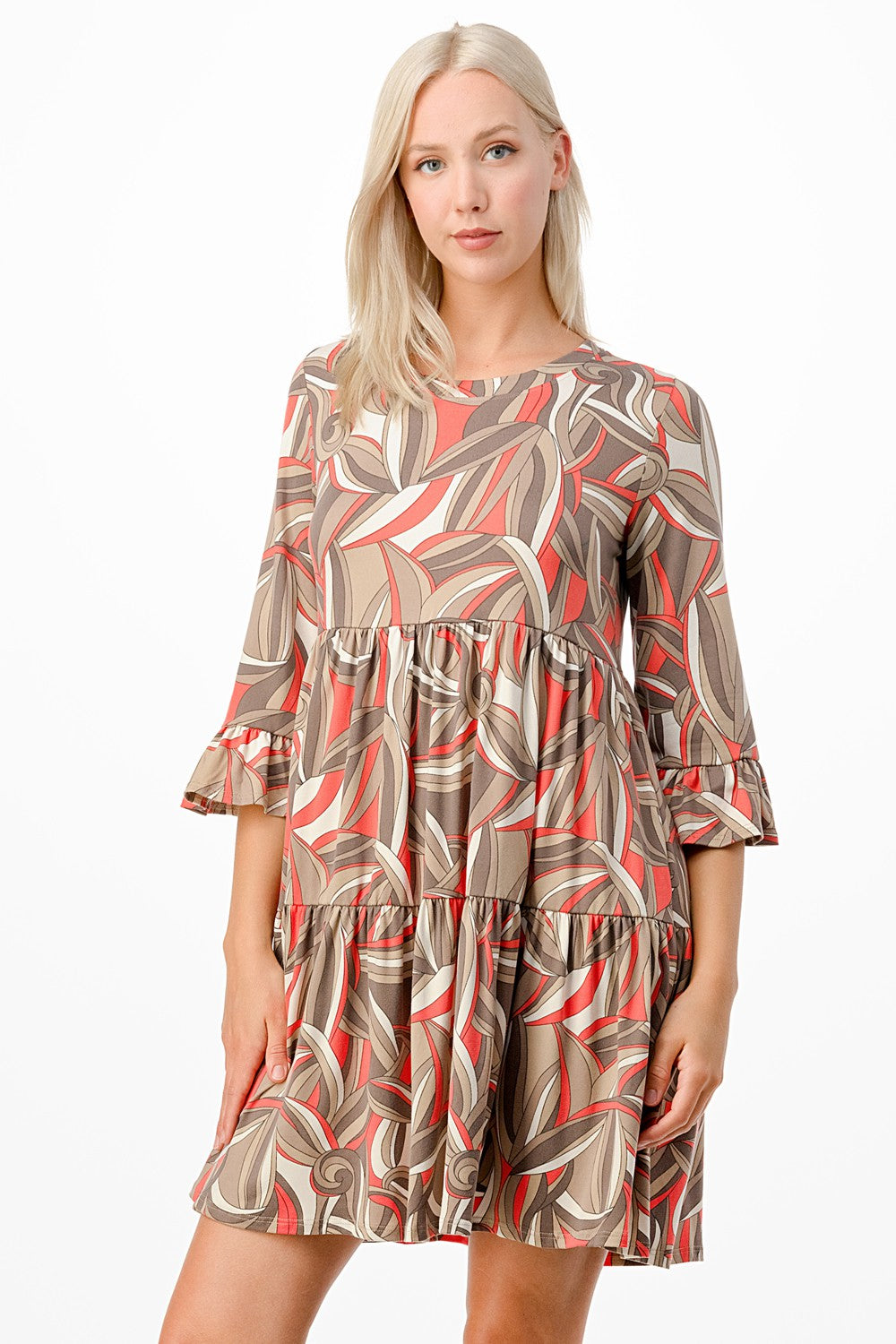 GEO PRINT RUFFLED 3/4 SLEEVES DRESS WITH POCKETS.