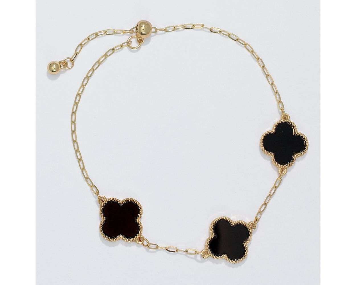Add some luck to your outfit with this gold bracelet featuring stationed black clovers. Perfect for those who love a touch of whimsy in their accessories.