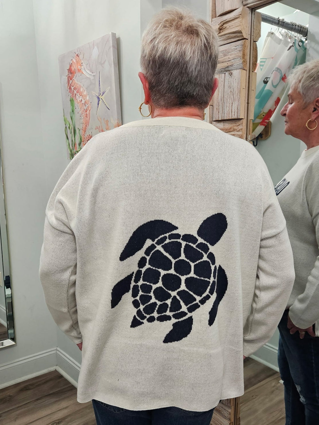 Sharon is wearing a size large. This is a true to size fit.