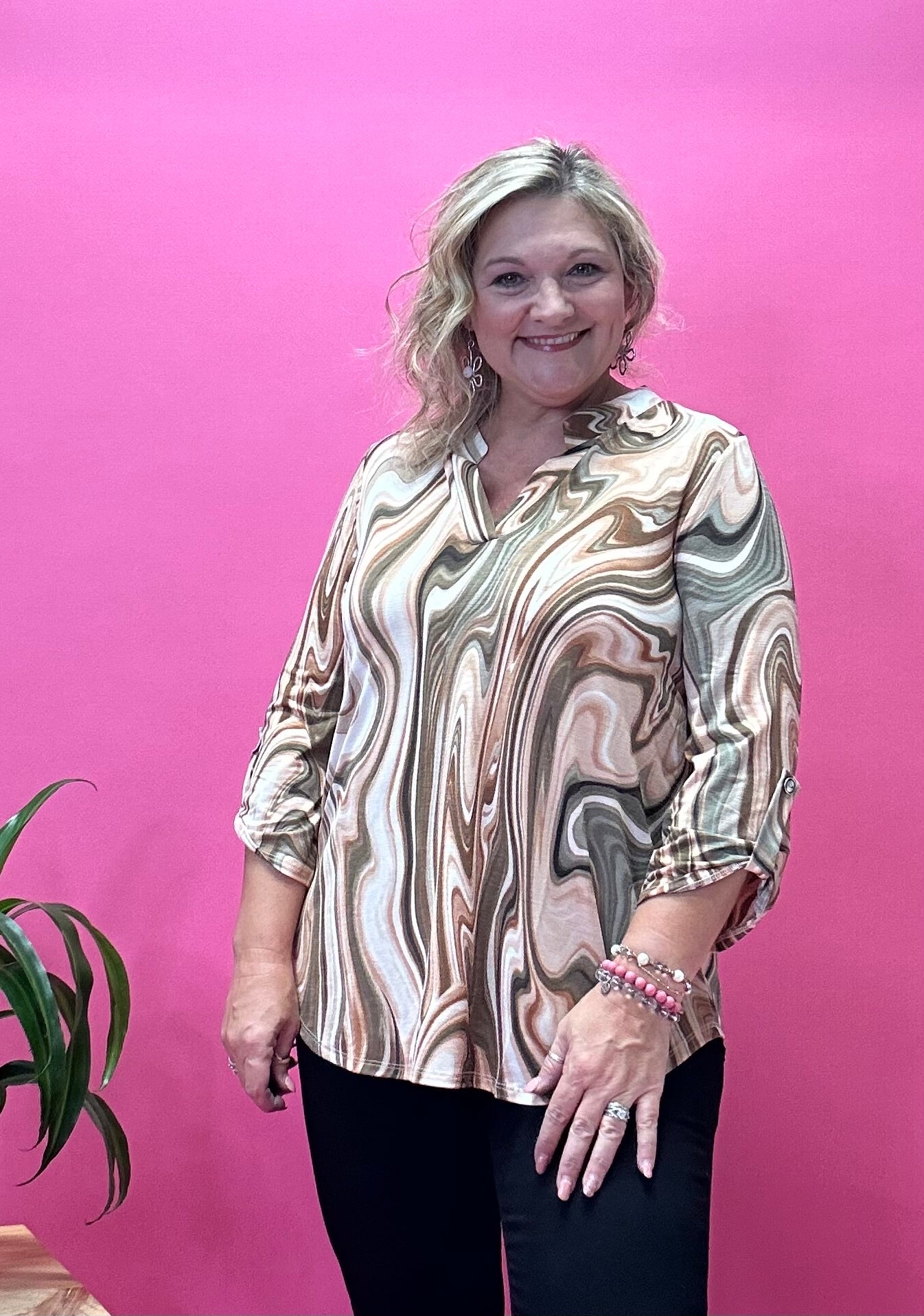 Look your best with the Hensley Lizzy Top! This classic design features a traditional gabby fit with a v neck and 3/4 length sleeves. The wrinkle-free fabric keeps you looking neat and professional all day, and the true-to-size fit ensures a comfortable fit that flatters your figure.