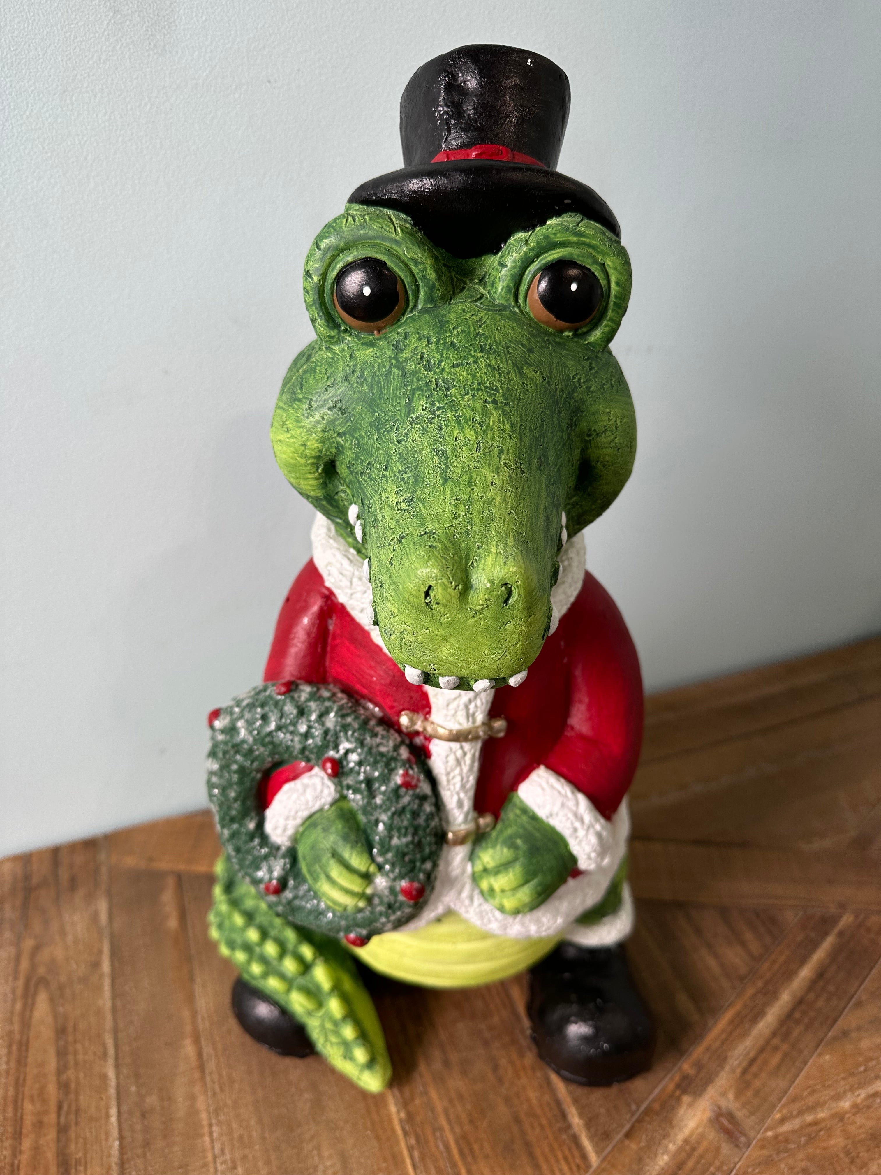 This Holiday Gator Statue is a charming addition to any home during the holidays. Standing tall at 19 inches, the alligator is dressed in a festive red Santa coat, a black hat, and holds a wreath. Perfect for capturing that special holiday spirit.