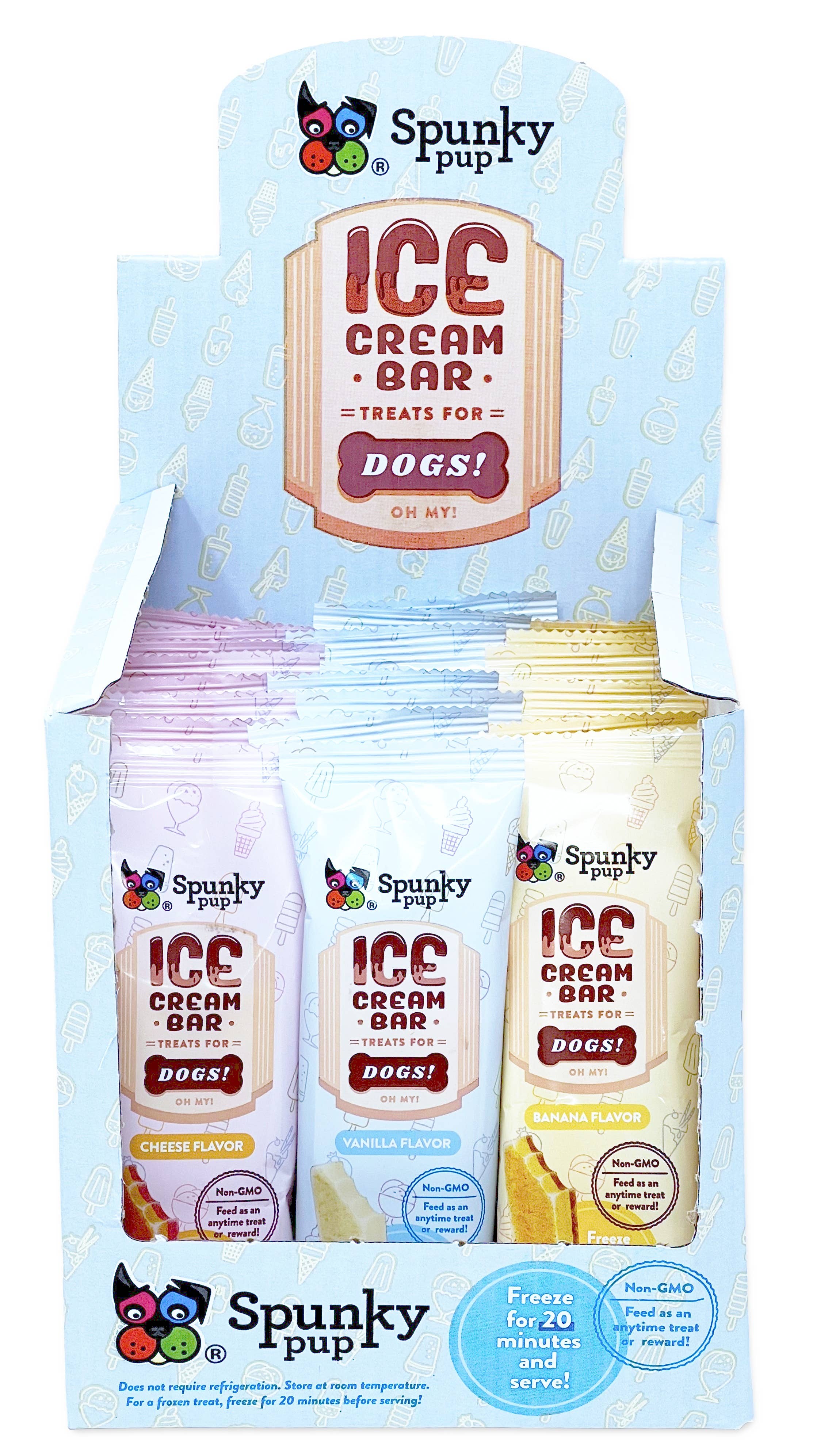 Introducing our newest treat that's sure to have your furry friend wagging their tail with excitement - our Ice Cream Bar Dog Treats! These delicious and refreshing treat comes in a convenient bar form that can be enjoyed straight out of the package, or chilled for an extra cool & tasty experience. Simply pop it in the fridge/freezer for 20 minutes and watch as your pup indulges in the creamy, chilled goodness. Made with only the best ingredients, our Ice Cream Bar Dog Treat is shelf-stable and comes in three mouthwatering flavors: vanilla, banana, and cheese. Each bar is individually-wrapped.