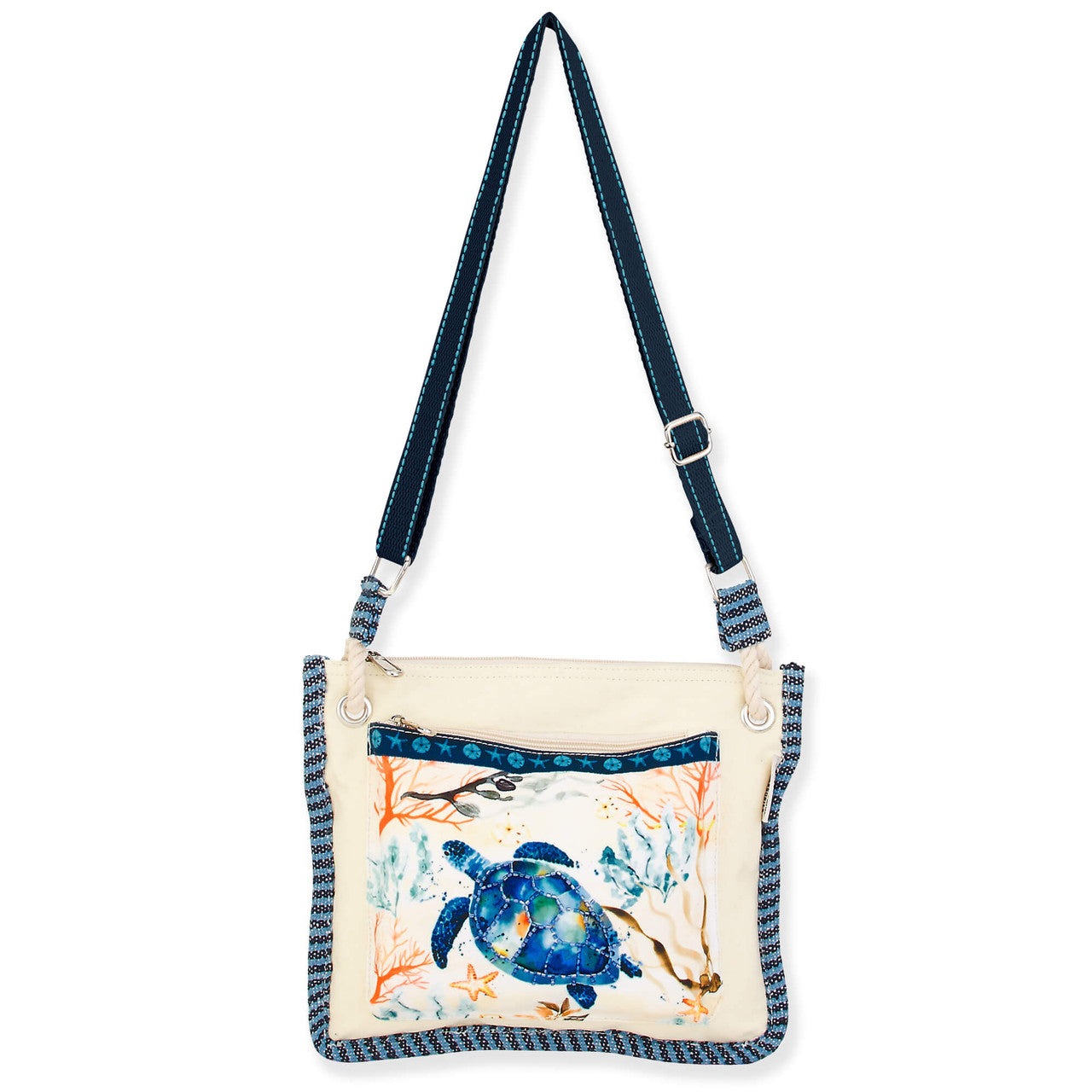 Get ready to shell out some serious style points with the Lena Indigo Turtles Crossbody! Made of artistic canvas with an adorable turtle pattern and matching lining, this quirky bag is perfect for beach trips. Plus, with a zipper top, adjustable strap, and interior/exterior pockets, it's as functional as it is fun!