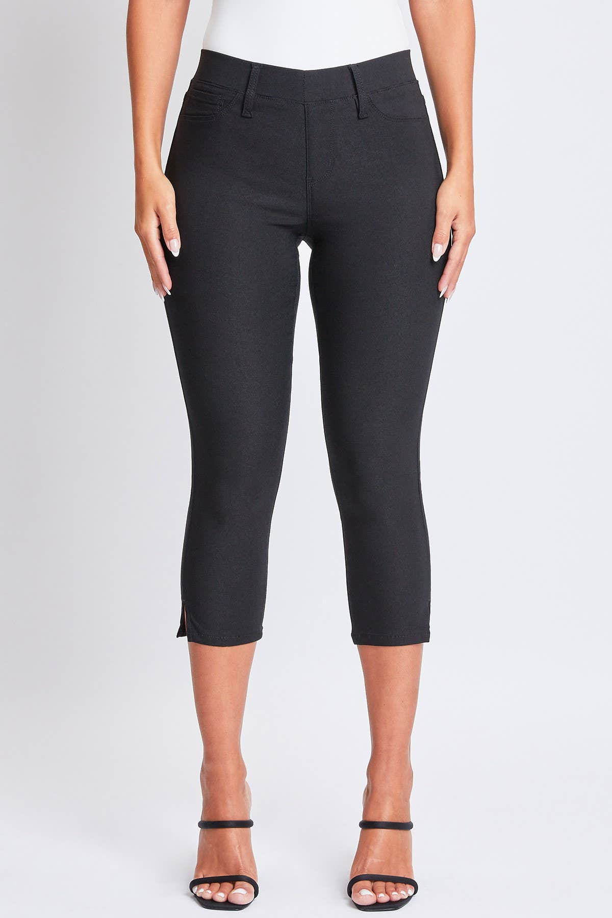 Looking for a flattering and comfortable capri? Look no further! Our Junior Hyperstretch Pull On Capri With Side Slit is made with our most stretchy and flexible fabric, making them perfect for all day wear. They feature front faux pockets for a smoothing effect, and functioning back pockets for the essentials! Available in a variety of colors for you to choose from! Product Details: -Mid-Rise -Faux Front Pockets -Functioning Back Pockets -Capri Length -Side Slit Hem Size and Fit (based on size S): -Inseam: 23" -Rise: 9.5" -Leg Opening: 13" Machine wash cold, separately inside out. Dry Flat.