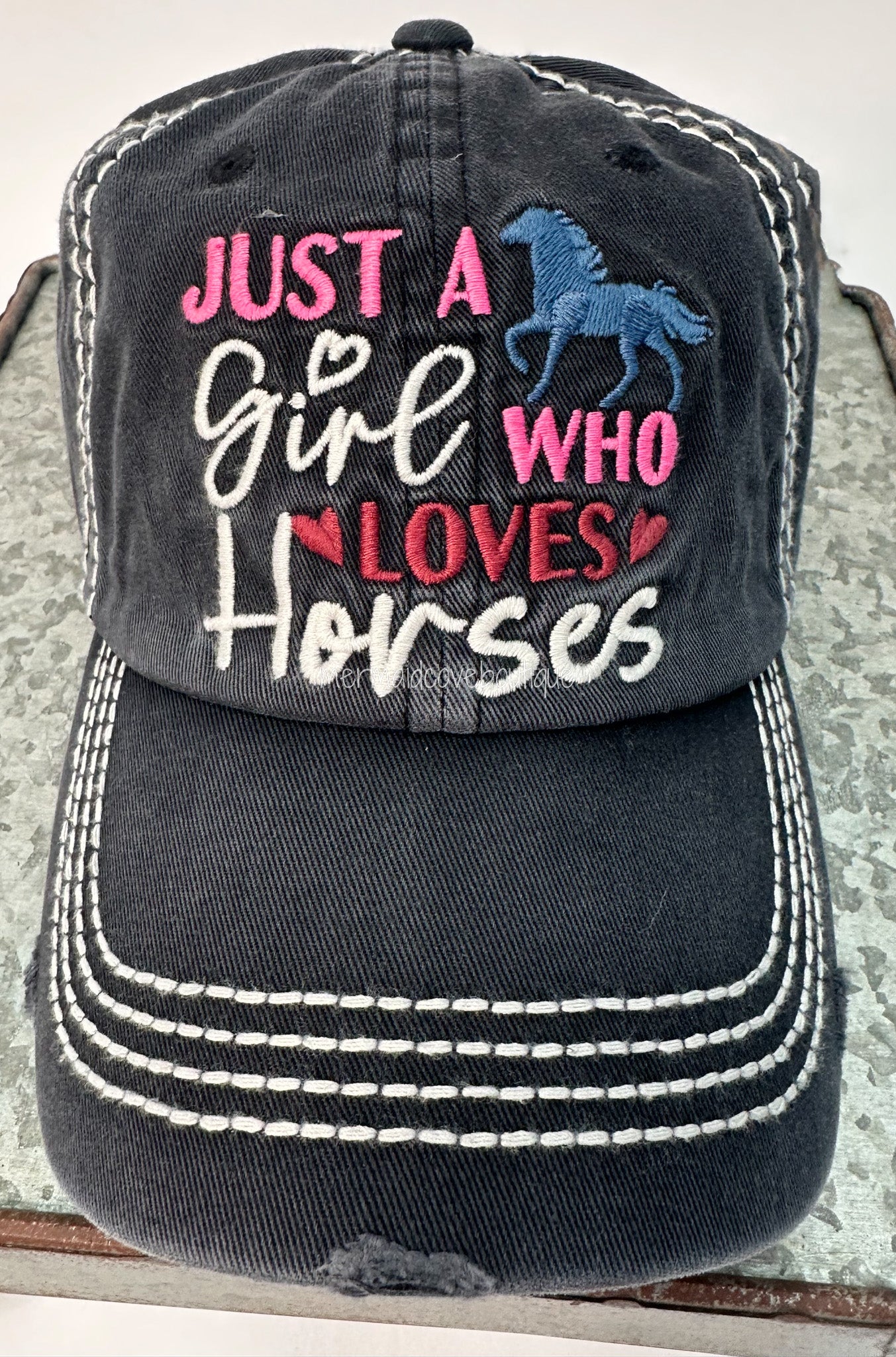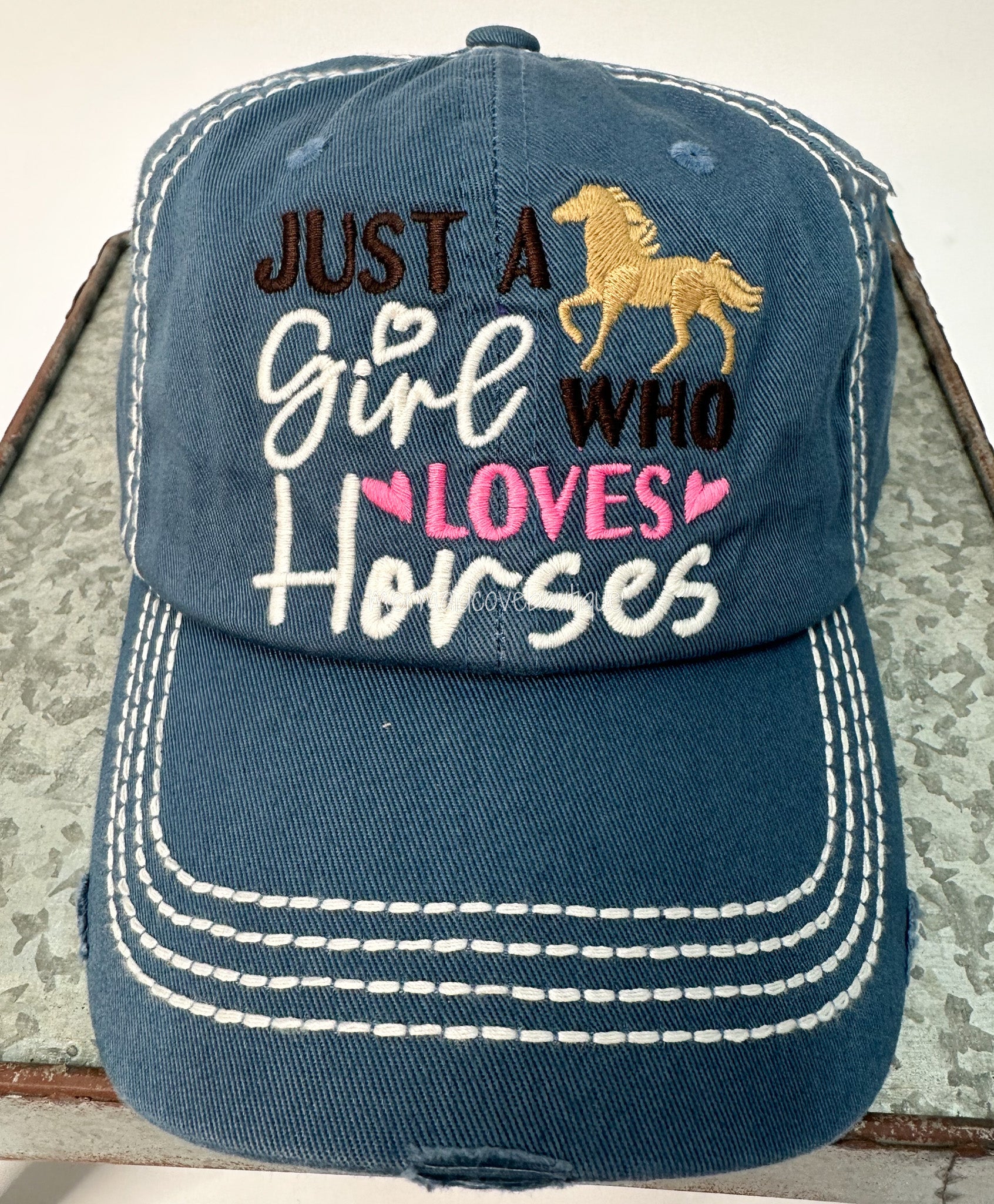 This hat is a horse lover's dream come true! Whether you're trail riding or casual riding, keep your head in the clouds with the Just A Girl Who Loves Horses Hat! Perfect for every equestrian, this comfortable and stylish hat will make galloping around town a breeze. Saddle up and show off your love for the hooved ones!!