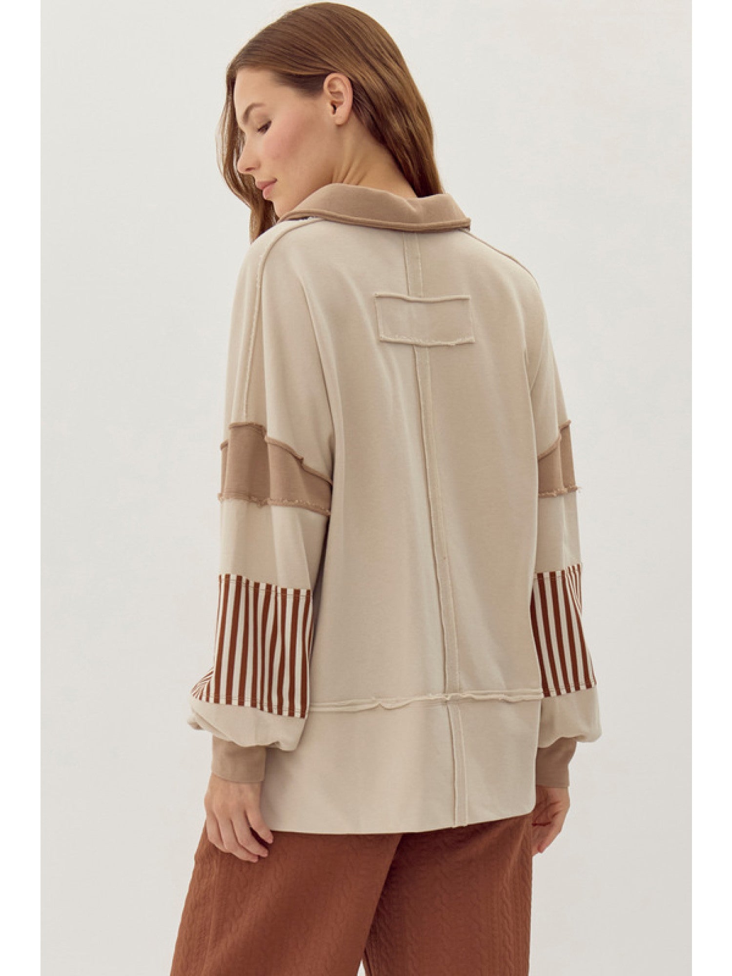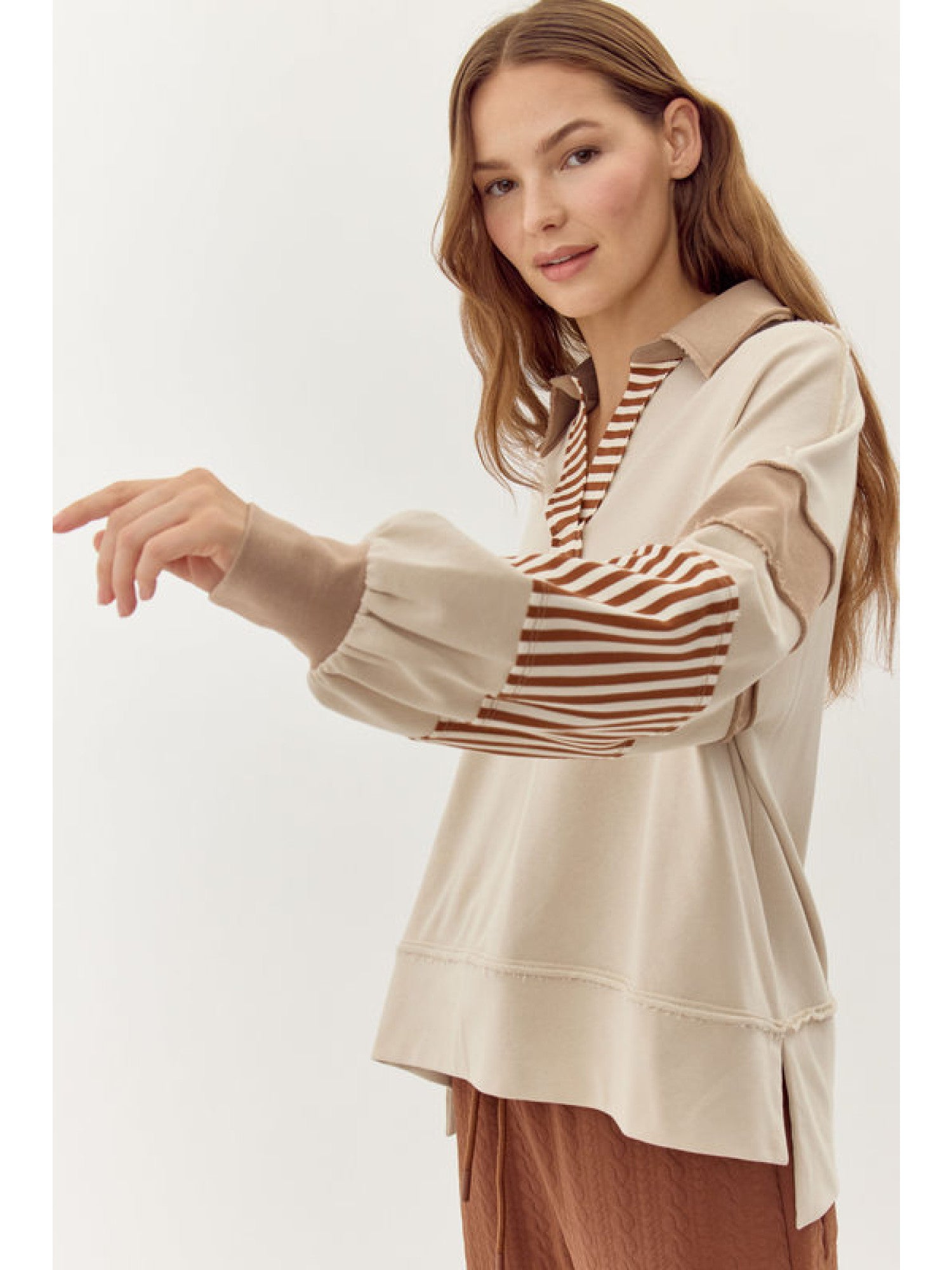 Stay effortlessly chic and cozy in our Keep it Sweet Sweatshirt. Featuring a mix of stripes and color-blocking, a notched collared V-neck, and raw-edge detailing, this lightweight top is perfect for everyday wear. Complete with long sleeves and side slits for a flattering fit.