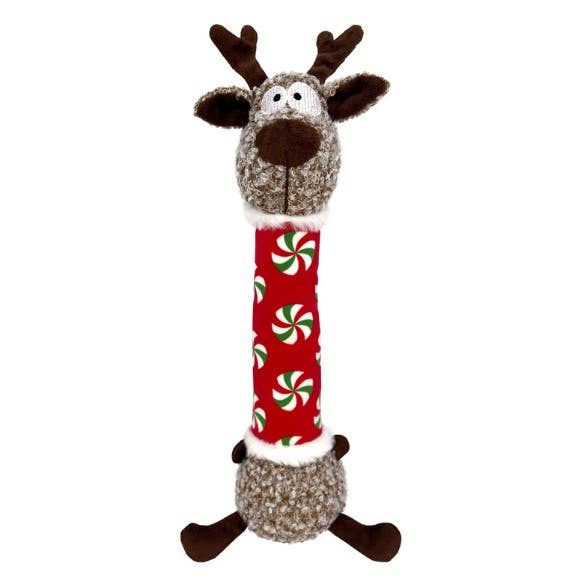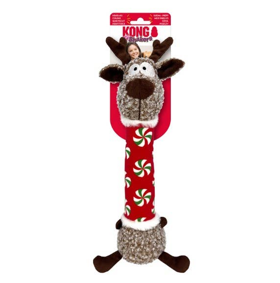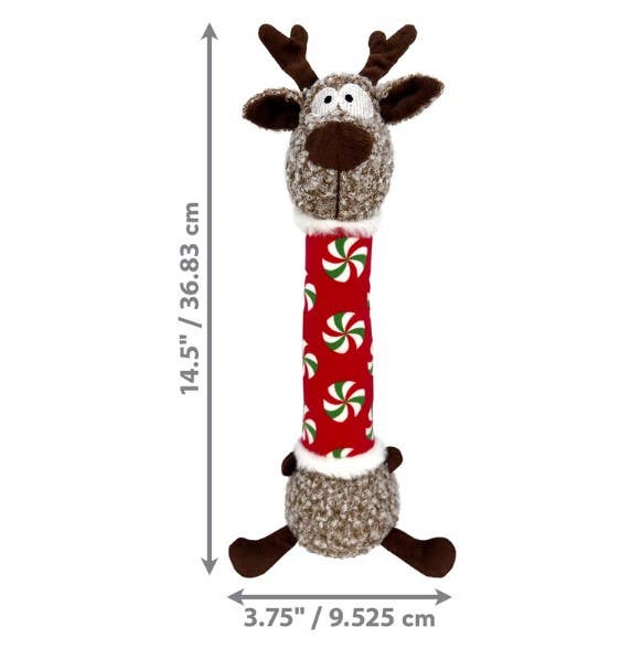 KONG Holiday Shakers Luvz Reindeer’s long, floppy body satisfies dogs’ shaking instincts. Low-tone squeaker keeps dogs playing through the holidays and beyond, providing tons of healthy, active play with a pal dressed up for the holidays.