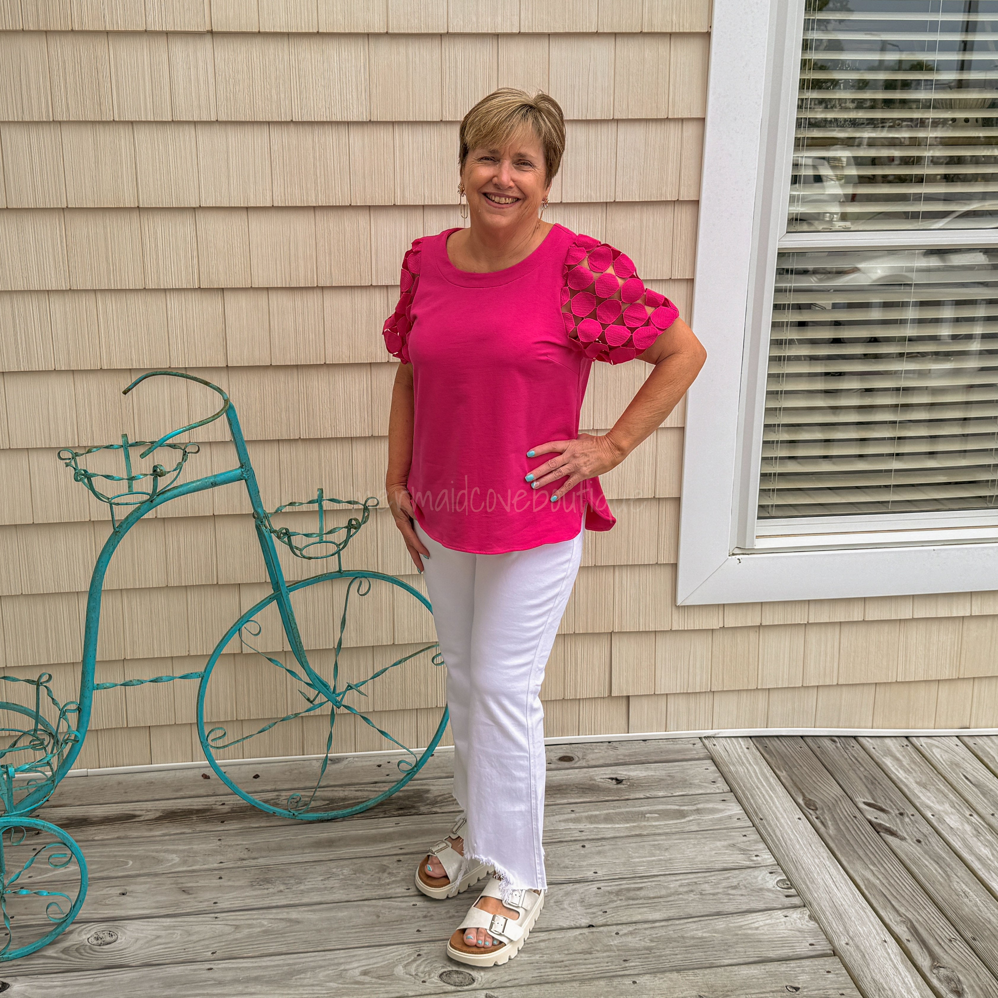 Show off your playful side with our Lacey Summer Top! Featuring a round neck and a high low hem, this top is perfect for any occasion. The textured lace puff sleeves add a touch of whimsy and charm. Spice up your wardrobe with this quirky and fun top!