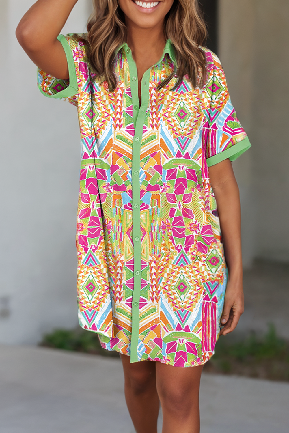 Make a statement with our Time it Out Dress. This geometric print contrast short sleeve shirt dress exudes casual style, perfect for everyday wear. Embrace the season with its playful pattern and lightweight design. A must-have for your spring/summer wardrobe.