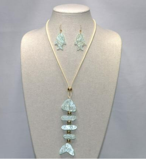 This lucite bonefish necklace features a beige leather cord with matching mint earrings.