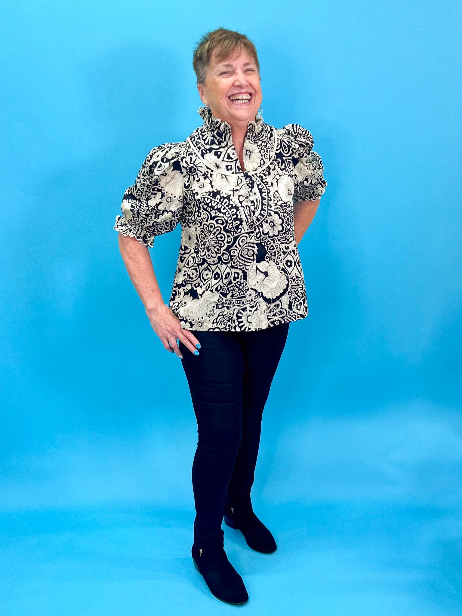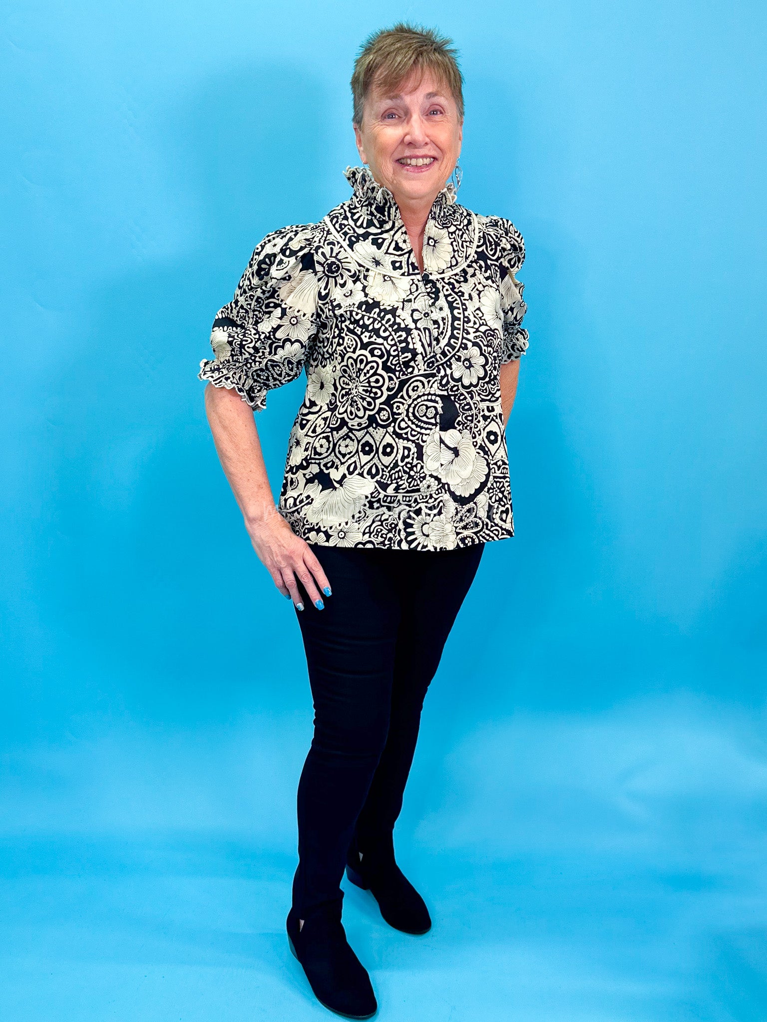 This top from Umgee is a wardrobe necessity. Featuring a scalloped high collar, half sleeve, and round yoke with buttons, this Malone Top in Black is the perfect combination of style and comfort. Make it a part of your wardrobe today. 100% cotton