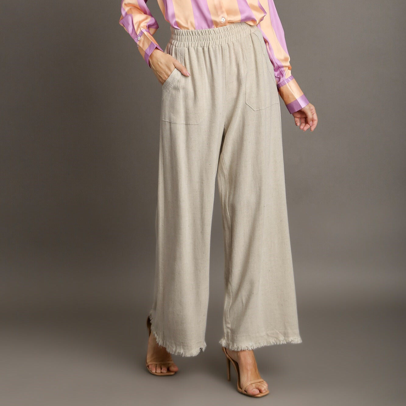 Get ready to lounge in style with our Marie Pants in Oatmeal! These linen blend wide leg pants feature a comfortable elastic waistband, perfect for all-day wear. Plus, with side pockets and an unfinished frayed hem, you'll have both practicality and a touch of edginess. Don't miss out on these must-have pants!