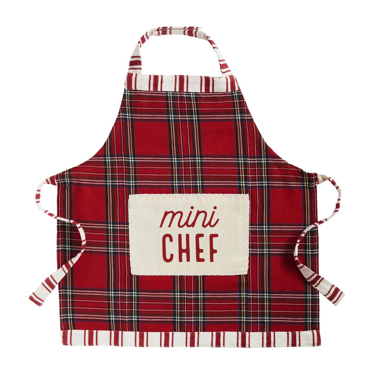 Description: Child sized woven tartan apron with front pocket. Adjustable neckline hardware.