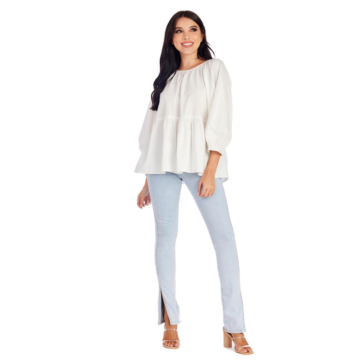 The Morrison Top in White is a playful addition to your wardrobe. Made from poplin, this top boasts three-quarter length sleeves, a swing hem, and charming bow back details. Perfect for adding a touch of fun to any outfit!