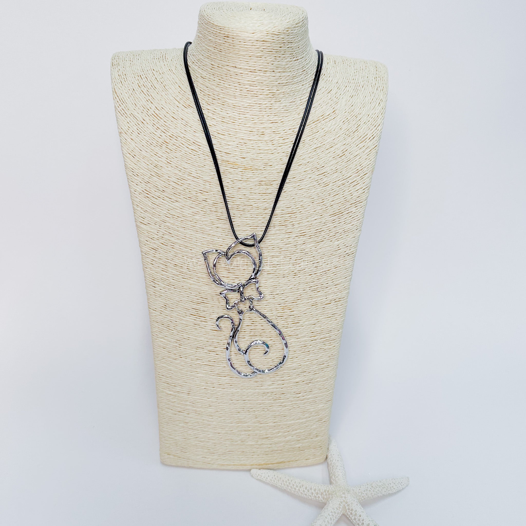 Show your love for furry friends with this purr-fectly sweet necklace! This charming piece features a silver kitty on a double layer leather cord - perfect for any cat-lover! Meow-tastic!