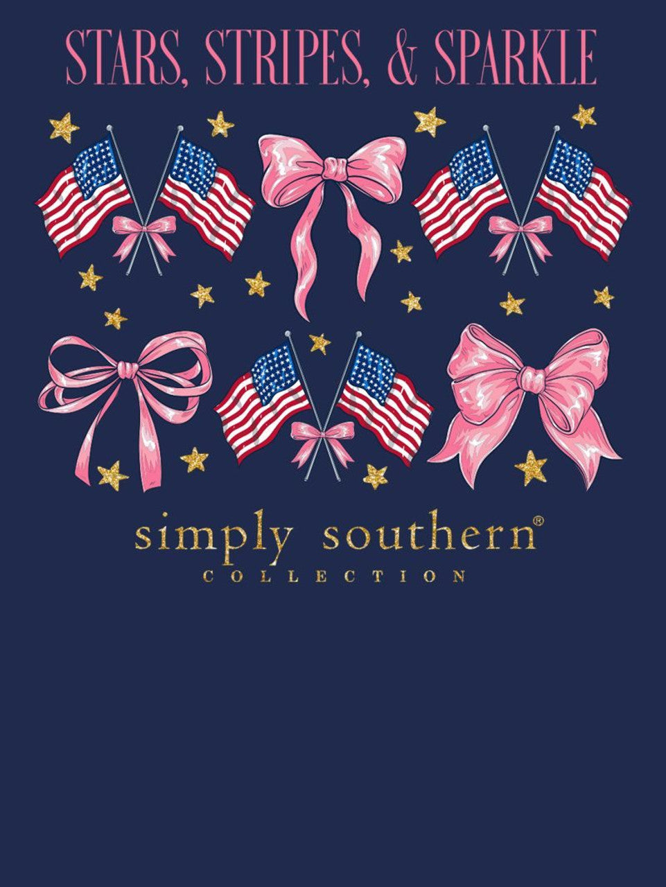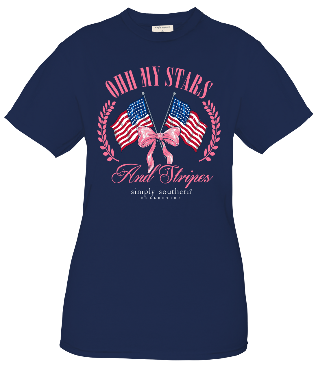 Looking for a playful and patriotic shirt? Look no further than the Oh My Stars Short Sleeve T-Shirt! Made from 100% cotton, this navy blue shirt features a fun and quirky design with a collage of American flags, pink hair bows, and gold glitter stars. The front boasts the phrase 'Oh my stars and stripes' in a cheeky nod to American pride. With unisex sizing, this shirt is perfect for anyone looking to show off their unique style. Simply Southern logo included.