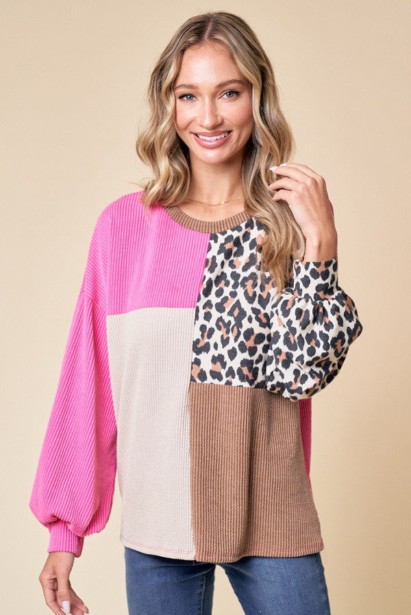 Make a statement in this bold, eye-catching Part of Me Top. The exclusive color-block style features a flattering mix of pink, cream, and mocha with a stylish pop of leopard print. Crafted from rib material, it's fitted with a round neckline and banded cuffs. Look fierce and feel fabulous!