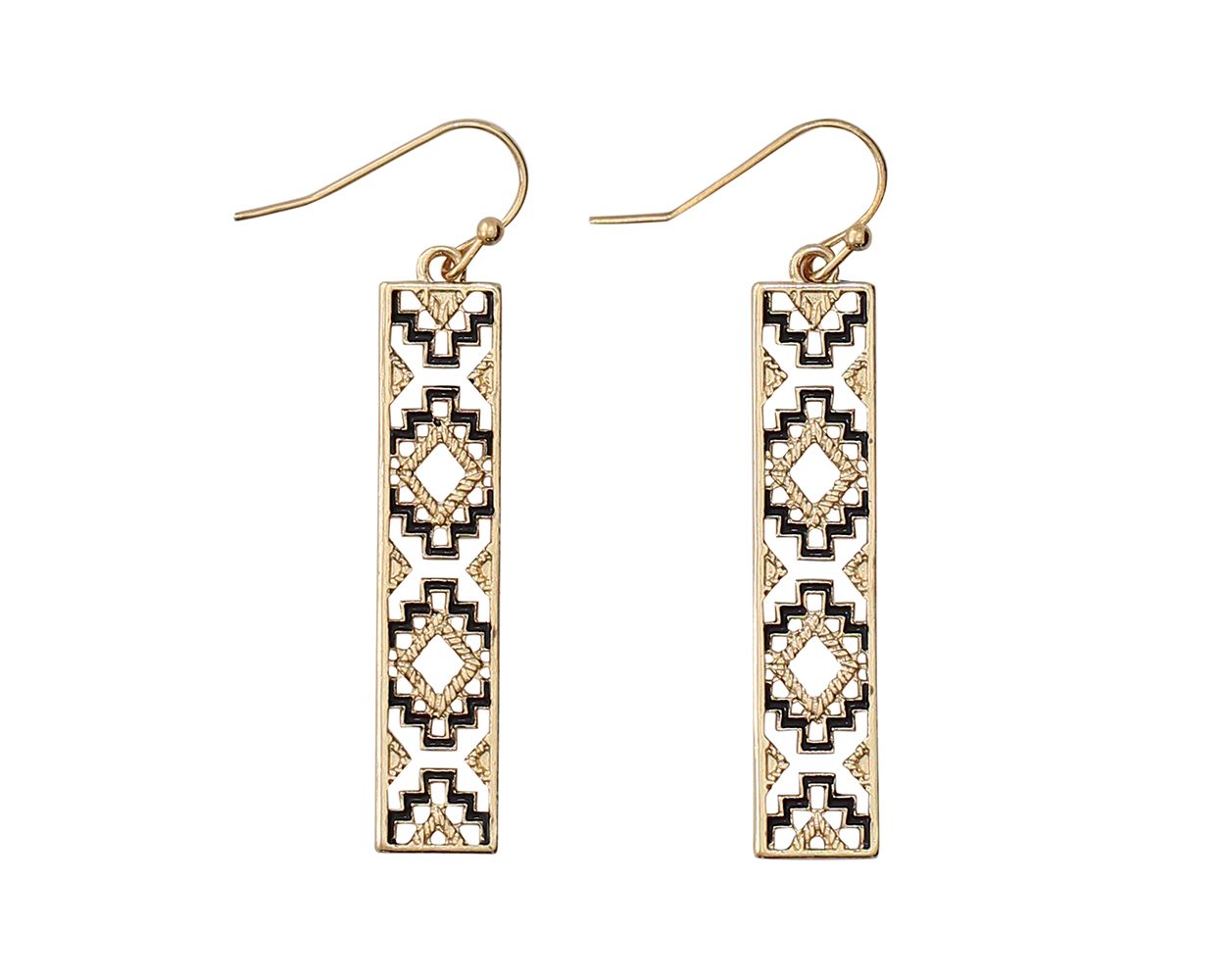 Slip on these open Aztec-patterned gold drops and show the world your effortless style. Add the perfect touch of shine and dazzle to any ensemble! Spice up any look and make a statement with these uniquely patterned earrings!
