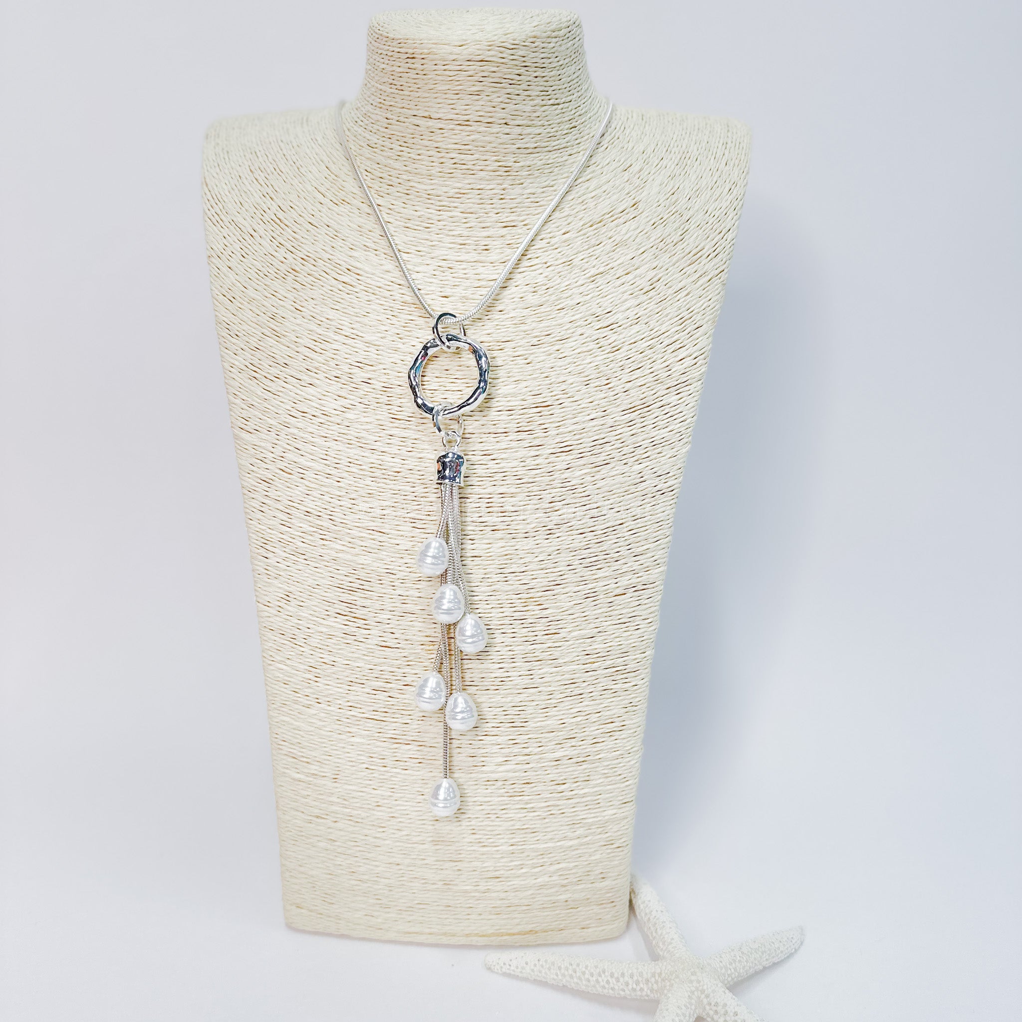 Make a statement with this Pearlie Tassel Necklace! This glistening silver snake chain features a multi pearl tassel drop for the perfect amount of pizzazz. A must-have for any stylish wardrobe!
