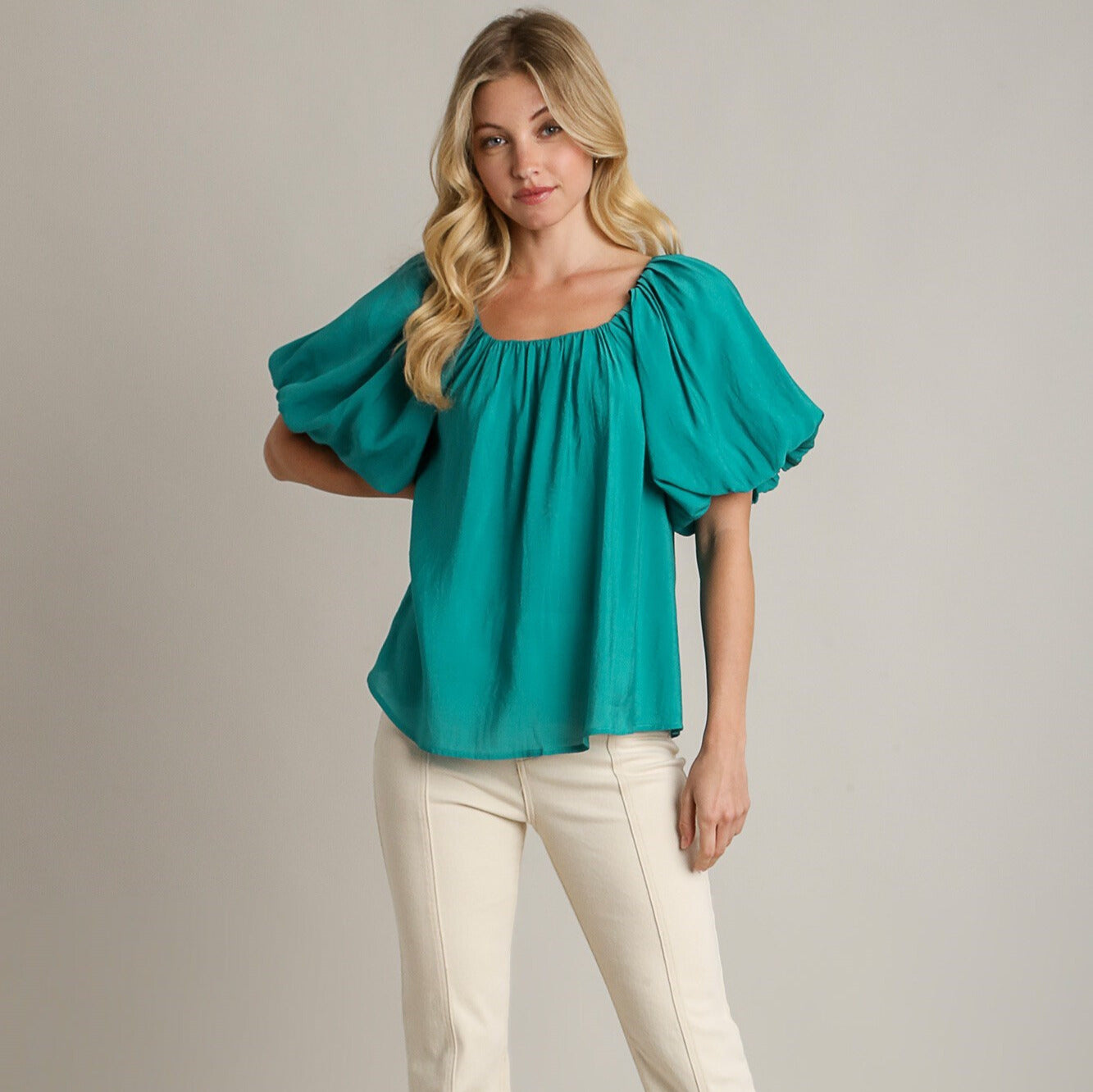 Introducing the Pleasantly Spring Top in Turquoise! Made from a soft modal blend, this round neck top features delicate pleats and shirring details for a flattering fit. Complete with playful short balloon sleeves, this top is the perfect addition to your wardrobe. (P.S. it's also super comfy!)