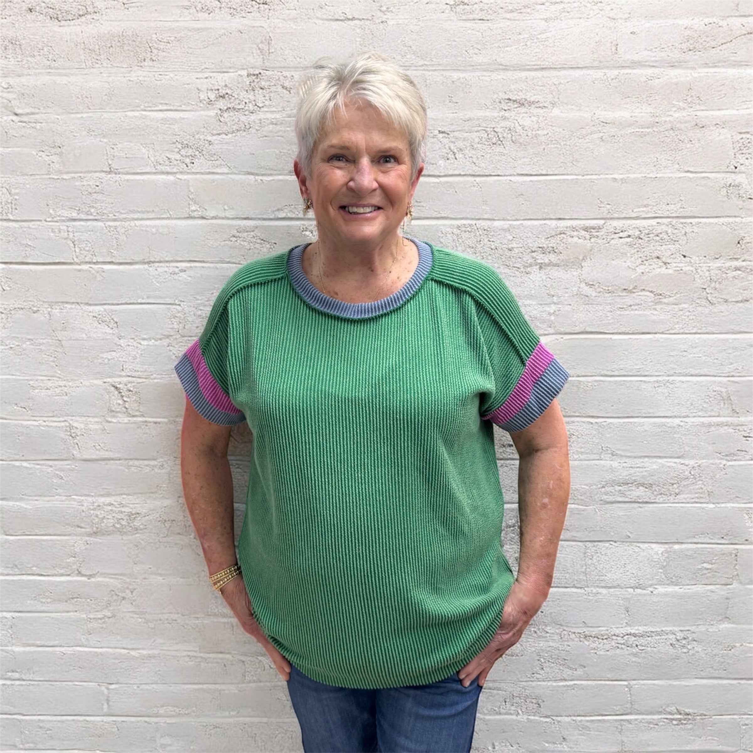 This ribbed top is a must-have with its round neck, color block contrast, and exposed stitch. The drop shoulder and casual relaxed fit offer effortless style and ultimate comfort. Elevate your wardrobe with this unique and playful piece.