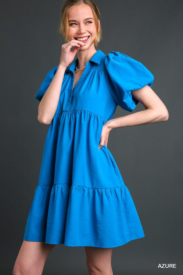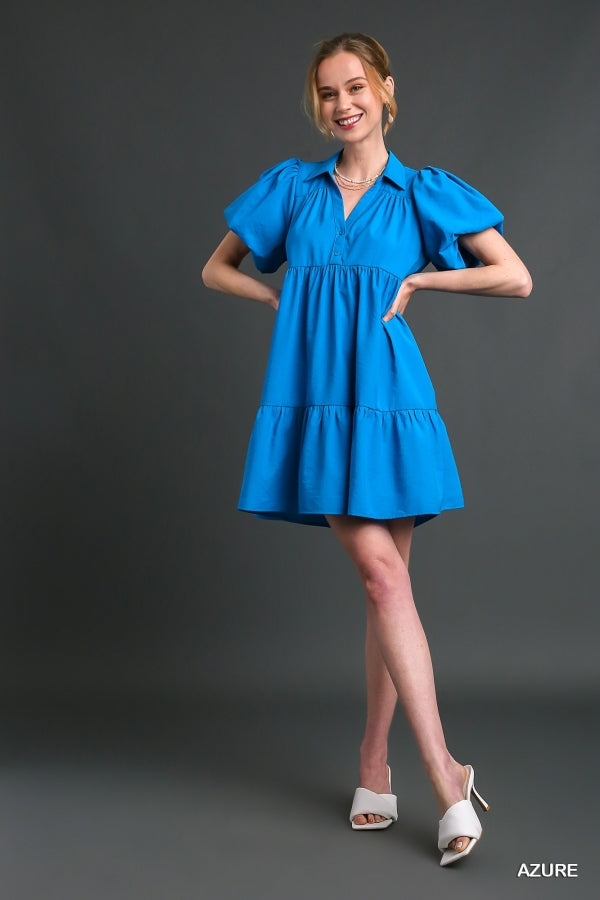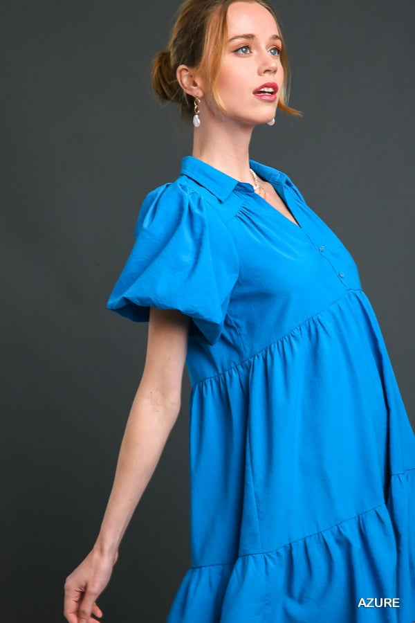 Look like royalty in this sophisticated dress. Featuring a short tiered design, collared neckline, puff sleeves with button details, this dress is sure to make a statement. Crafted with lightweight fabric, this dress offers comfort and style for any special occasion.
