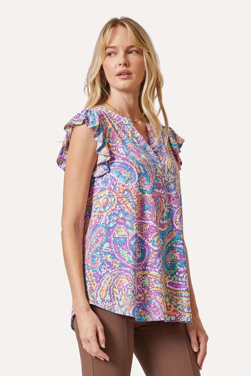 Capture the natural beauty of a sunset with our Scenic Sunset Lizzy Flutter Top. The fun flutter sleeves and premium prints add a playful touch, while the split neckline and easy, flowy fit offer comfort and effortless style. Wrinkle-free and non-sheer, this top is perfect for any adventure.