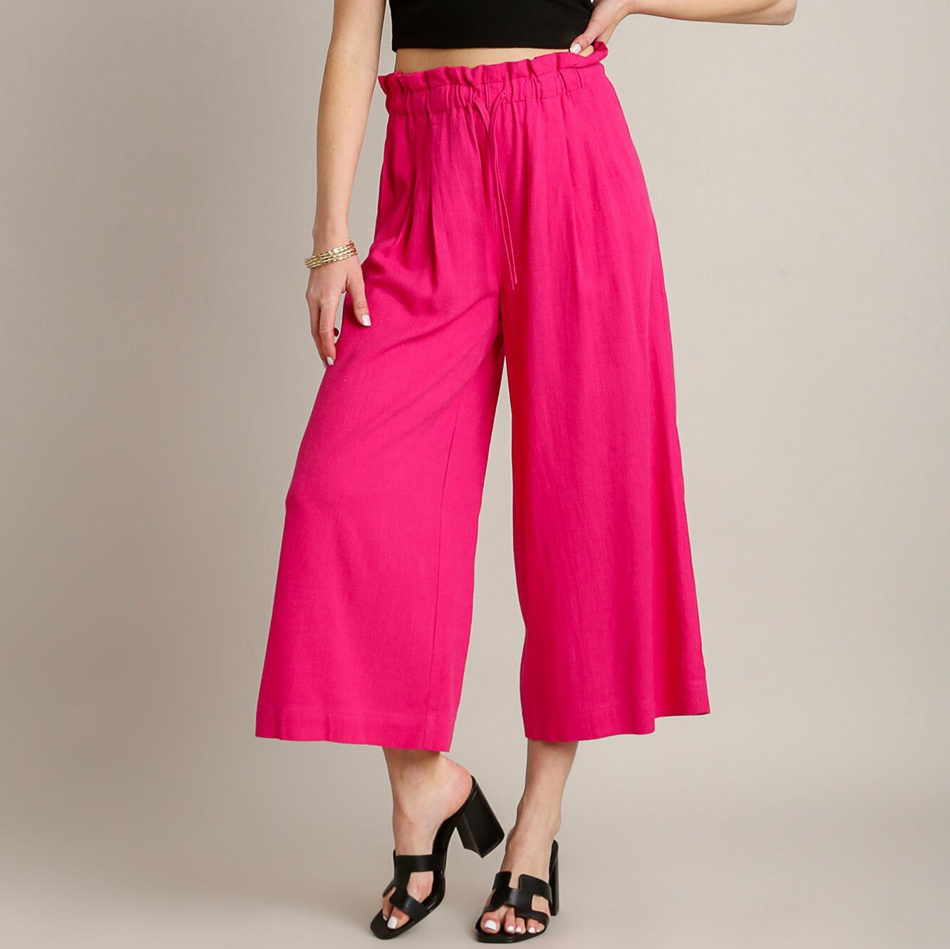 Introducing your new go-to pants for a fun and playful look! The Shannon Pants in Hot Pink are designed with a wide fit for comfort, a drawstring for the perfect fit, and side pockets for convenience. The added touch of a ruffle waistband adds a flirty and chic flair. Made with linen for a lightweight and breezy feel. Perfect for those days when you want to stand out with style!