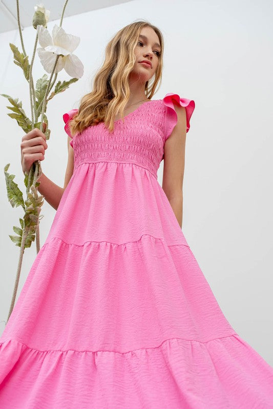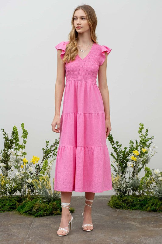 Twirl and twinkle in our Sierra Dress in Pink! With a flattering V neckline and flutter mini sleeves, this dress is perfect for any occasion. The smocked bodice and tiered midi skirt add a touch of whimsy, while the lining ensures a comfortable fit. Made with 100% polyester, this dress is both flirty and fun.