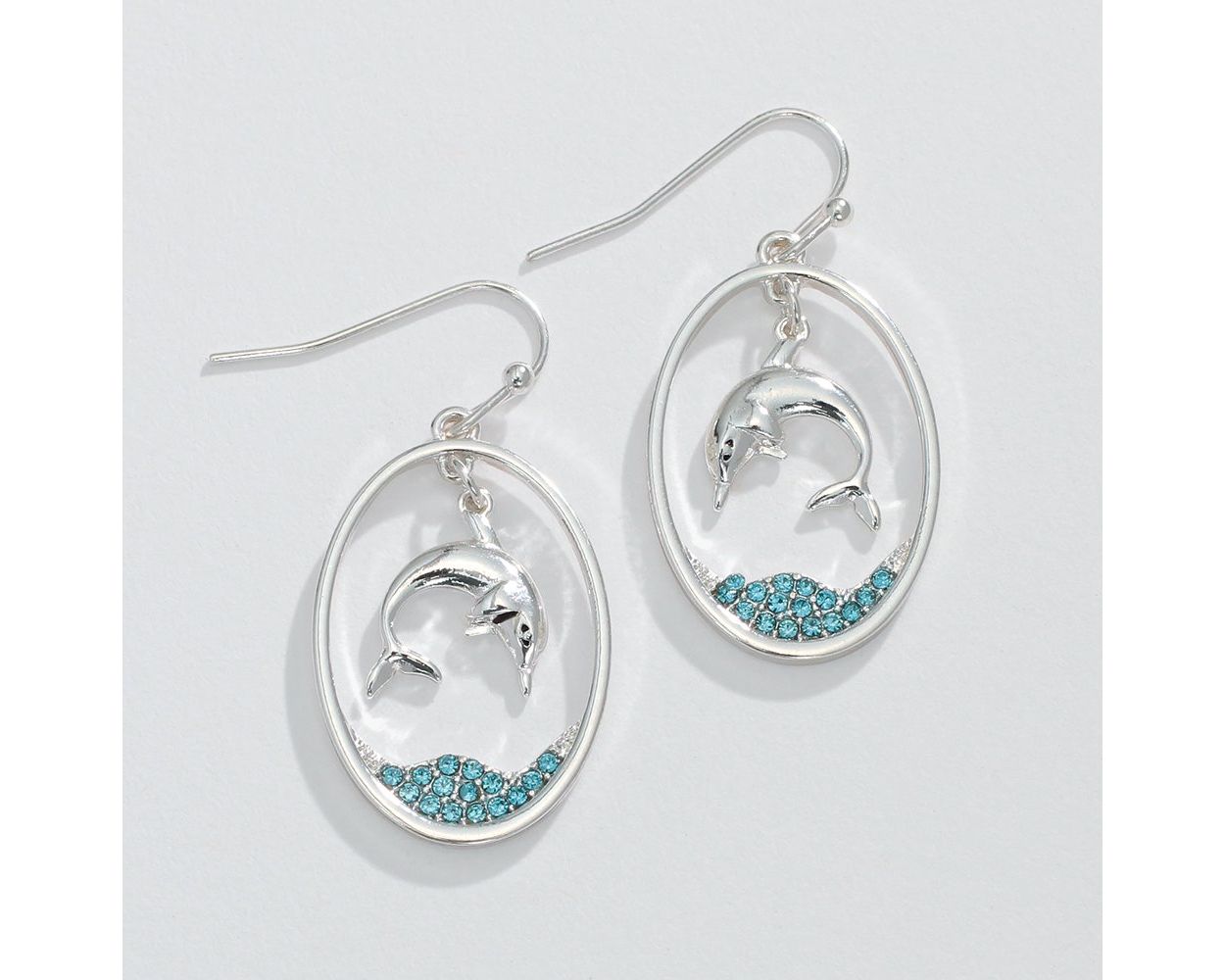 Make a splash with these playful Silver Dolphin & Blue Crystal Earrings. Featuring charming silver dolphins adorned with dazzling aqua crystals, these earrings add a touch of fun and sparkle to any outfit. Perfect for marine lovers and fashionistas alike!