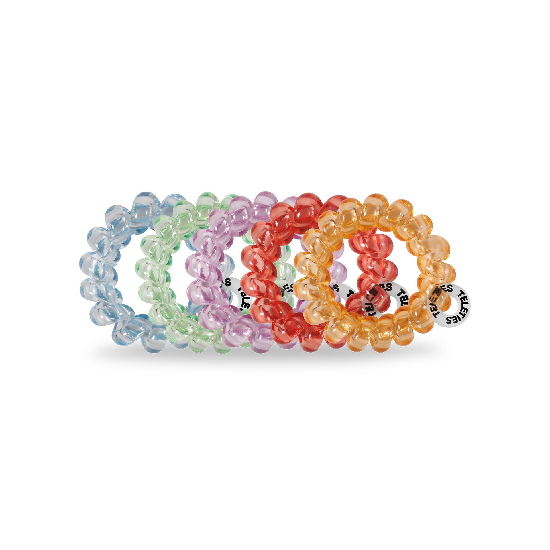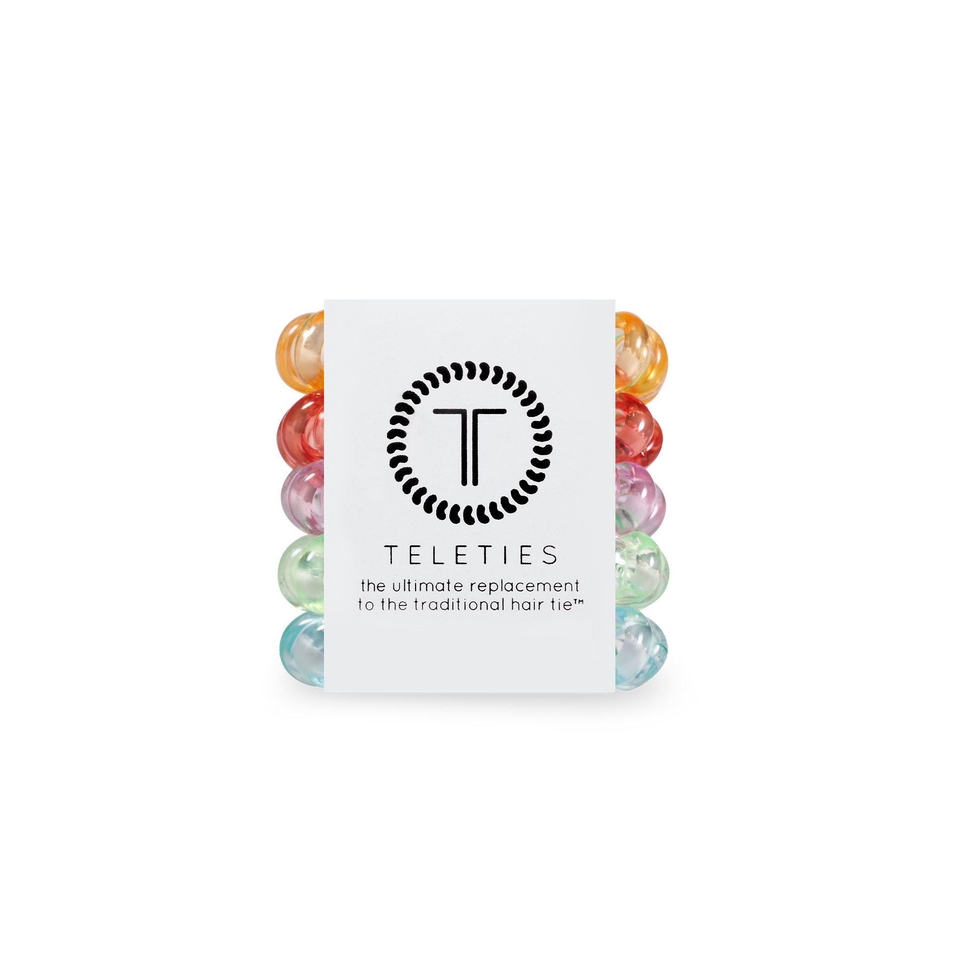 Small yet mighty, the tinyTELE boasts the same no-rip, strong-grip features you love and the fashionable styling you expect from TELETIES, now in smaller, tinier size. Perfect for little kids' hair, top knots, and the end of braids. Sold in packs of five. The tiny size is 2.5cm wide x 0.5cm thick.