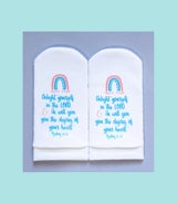 Rainbow hearts design with Standing on the Word verse shown on sole