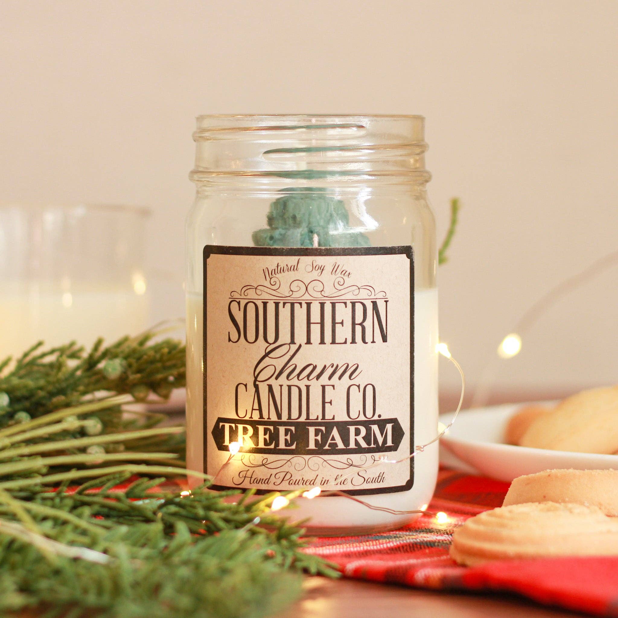 Our Tree Farm candle was created to evoke the fond memories of a day trip to the farm to select the perfect tree for Christmas. It has a rich evergreen scent, a snow white base, and is topped with a Christmas tree.